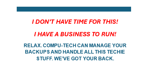 Always leave 20-30% of your backup storage free. This buffer ensures there’s room for emergency backups or unexpected file growth. If you’re beginning to max, call Compu-Tech for help. We can help you clean up your data or expand your storage if required.